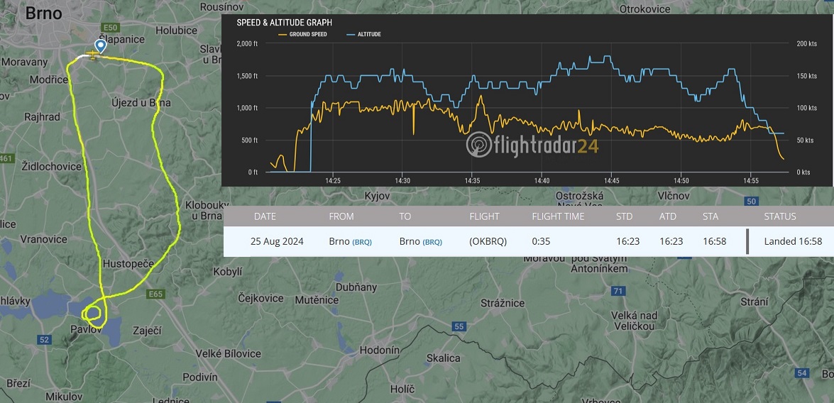 Let 25.8.2024 Více jak po roce a čtvrt další pokračování výcviku s Cessnou. Tentokrát byla hodně dlouhá přestávka ve výcviku. Sice jsem se prolétl s dvojplošníkem Bückerem 131, ale to byl spíše seznamovací let, než výcvik. Počasí se na naplánovaný čas dost zhoršilo, tedy hlavně přicházela studná fronta a tak se zvedl vítr, bohužel severní, což znamenalo, že bude foukat z boku na dráhu. Cessna má povolený maximální boční vítr 6,2m/s a jak píši níže foukalo trošku více. Nicméně instruktor řekl, že to zvládneme a také jsme to zvládli. Pro navigaci jsem použil mobil s GPS a také jsem využil program, který mi ukazuje letadla poblíž letící, taková náhrada radaru. LKTB Brno start dráha 27 s delším rozjezdem, přistání dráha 27. Letadlo Cessna 152 - OK-BRQ. Počasí skoro jasno, vítr S o rychlosti 6,5m/s, poryvy 13m/s, teplota 30°C, dohlednost výborná. Mapa letuVidea z průběhu letu: (Videa jsou neupravovaná, jak je natočila kamera.) 1 část